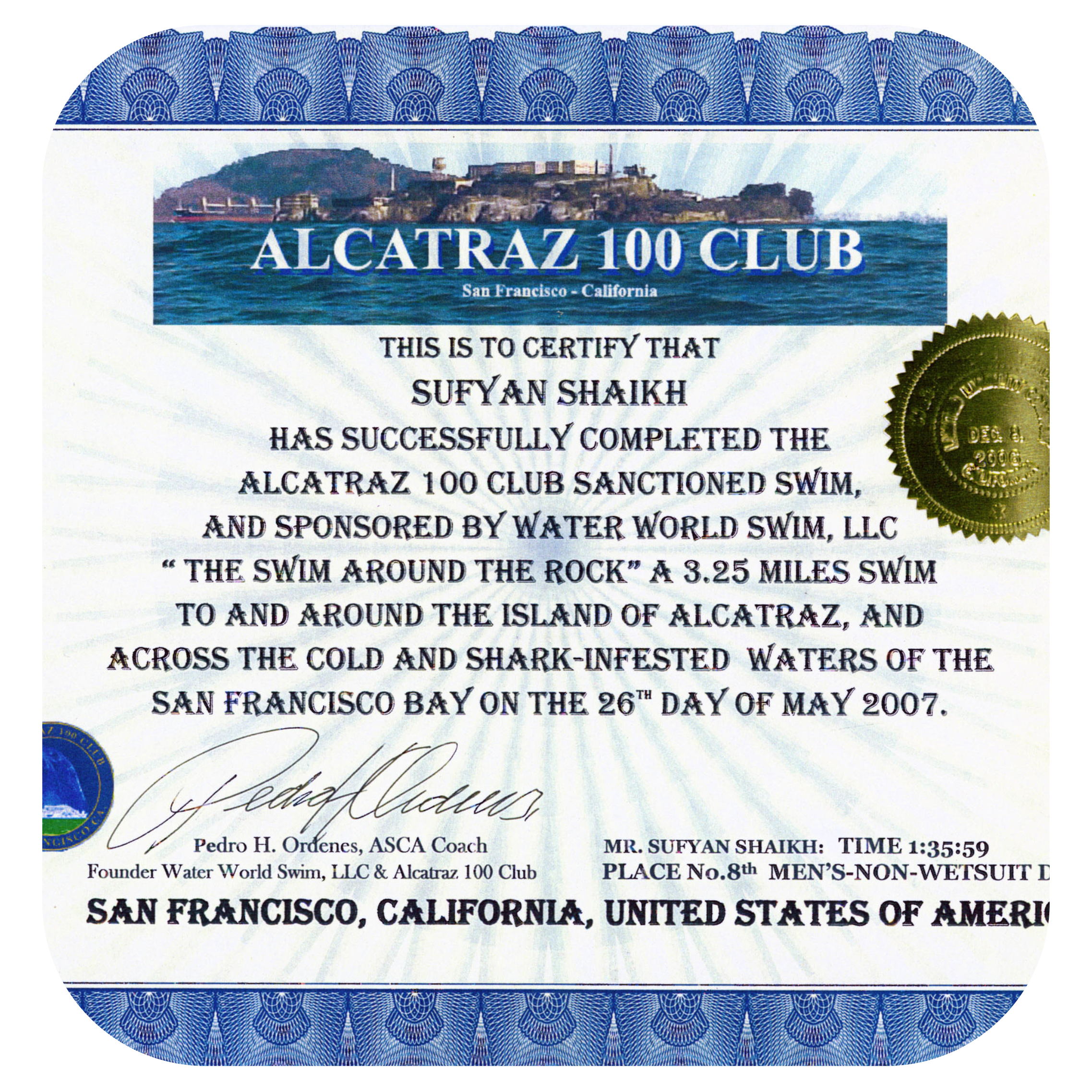 In 2007, I took on one of my coldest swims yet when I swam around Alcatraz Island. Despite the water temperature being a bone-chilling 8 degrees Celsius, I completed the 6 km distance in just 1 hour 35 minutes. Adding to the challenge, I did the entire swim without a wet suit, proving my mettle to the local swimming community.